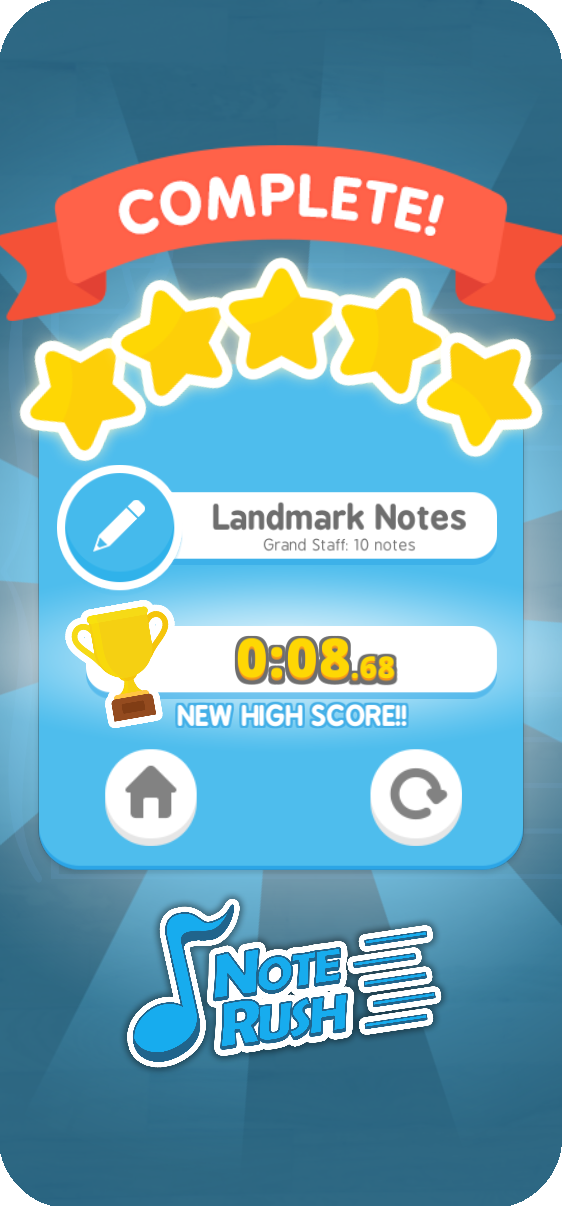 Note Rush features a unique landmarks-based hints system (optional) that highlights nearby landmark notes to read intervallically from. Over time students naturally move from reliance on landmarks to a more intrinsic staff-to-keyboard association.