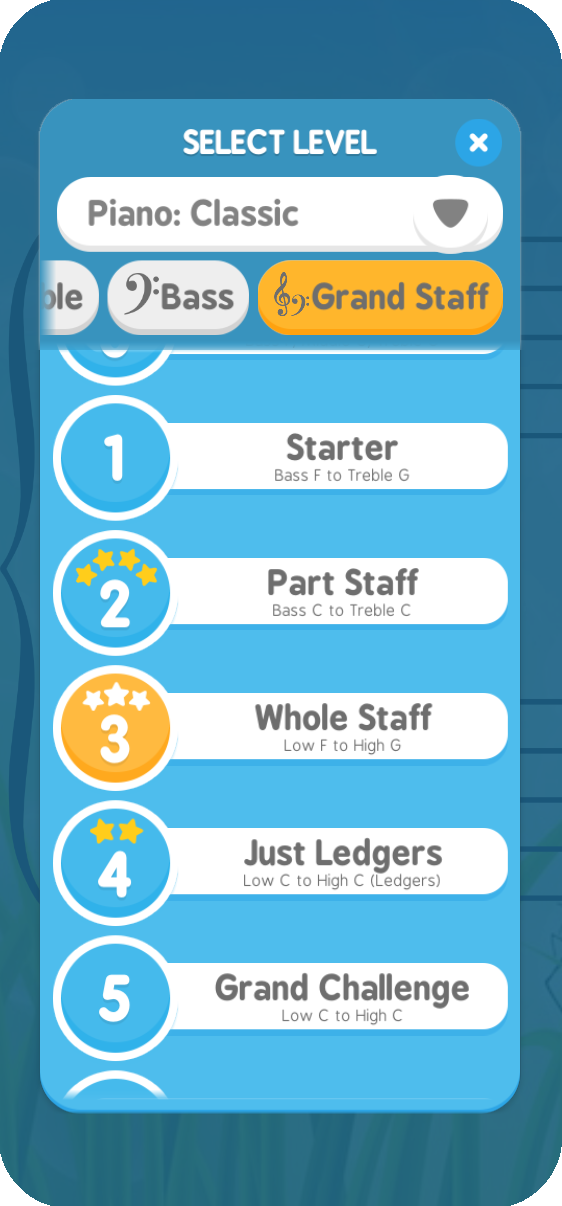 Note that this setup means you get 3 stars for completing Piano-Classic Level 3 (Whole Staff) in one minute or less, which many piano teachers use as the requirement for entering the ‘One Minute Club’.